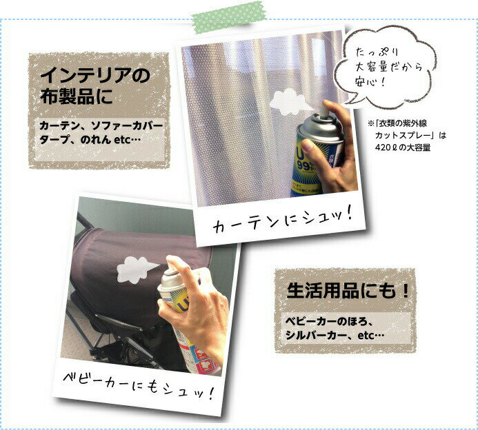 【お徳用】『衣類の紫外線カットスプレー』UVカットスプレー(衣類・布用)大人気♪紫外線対策スプレーです。たっぷり大容量だから色々なものに使えますね。UVカットスプレー/紫外線カットスプレー/紫外線防止